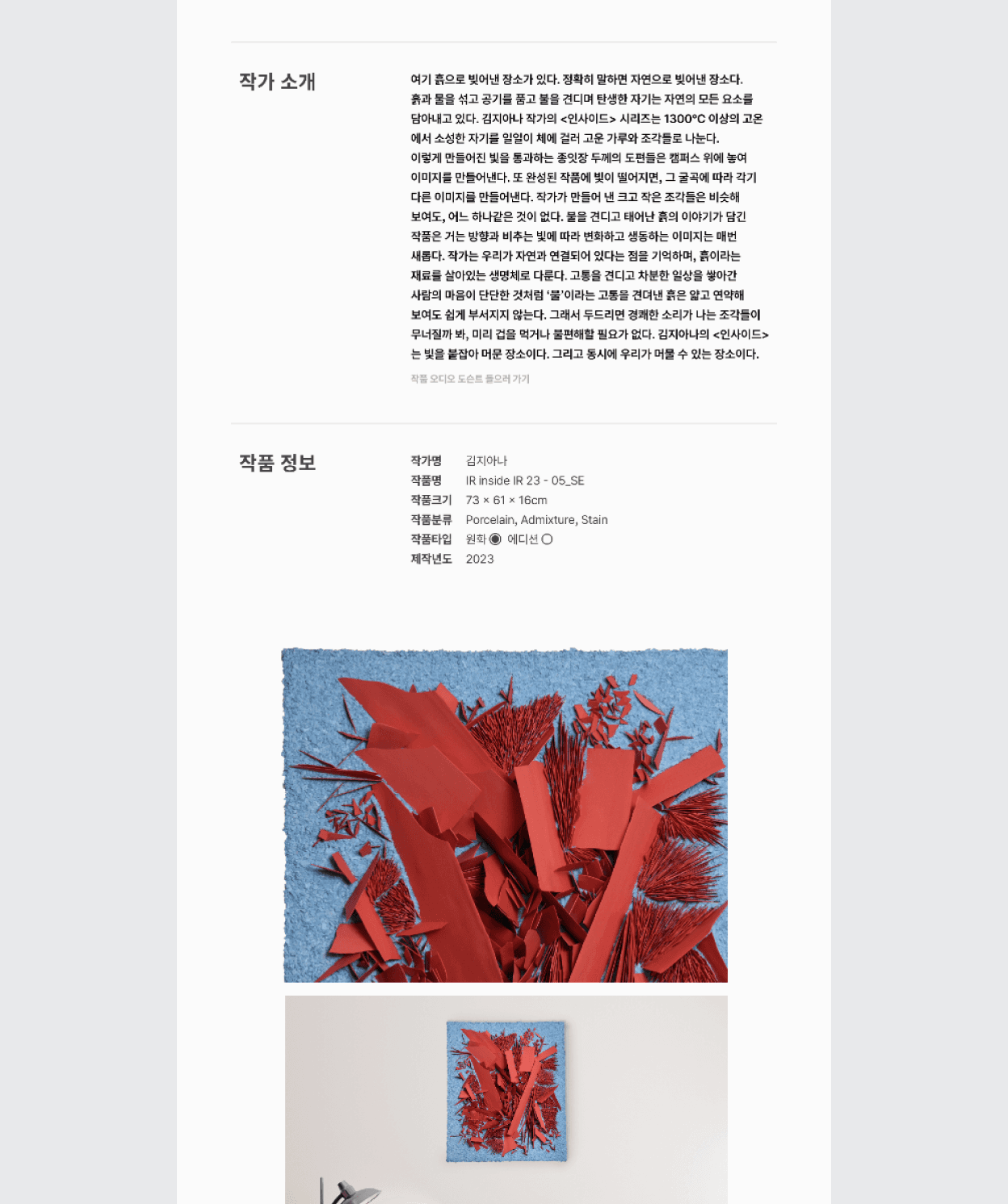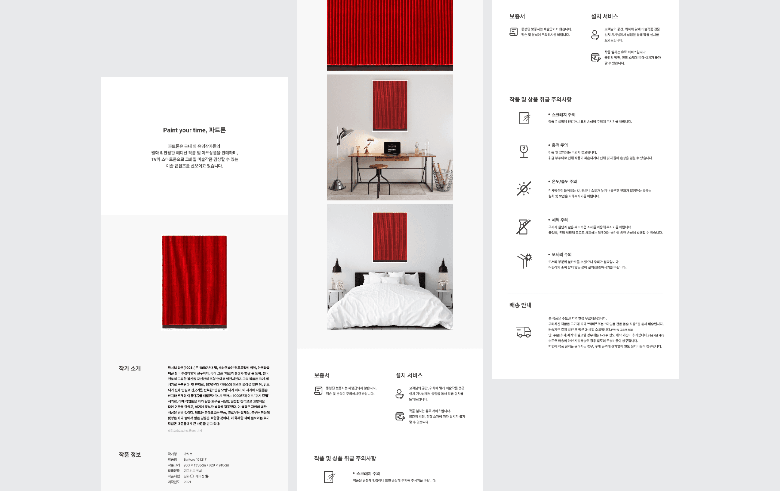 I designed a detailed promotional page for a limited art edition in collaboration with Hyundai Department Store. To help customers visualize how the artwork would integrate into their own spaces, I created realistic mockups by compositing the pieces into interior environments at true-to-life scale. I also developed a set of intuitive icons to clearly communicate key care instructions and precautions regarding potential damage.