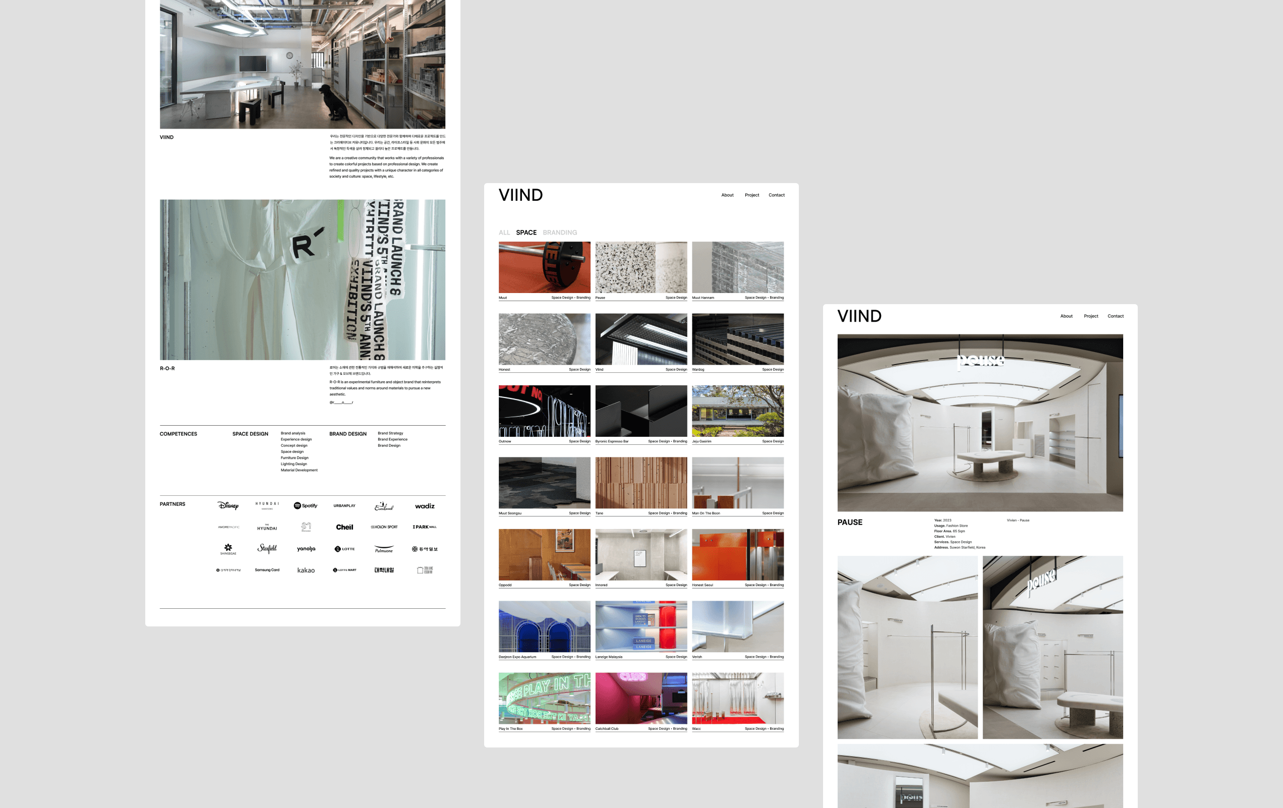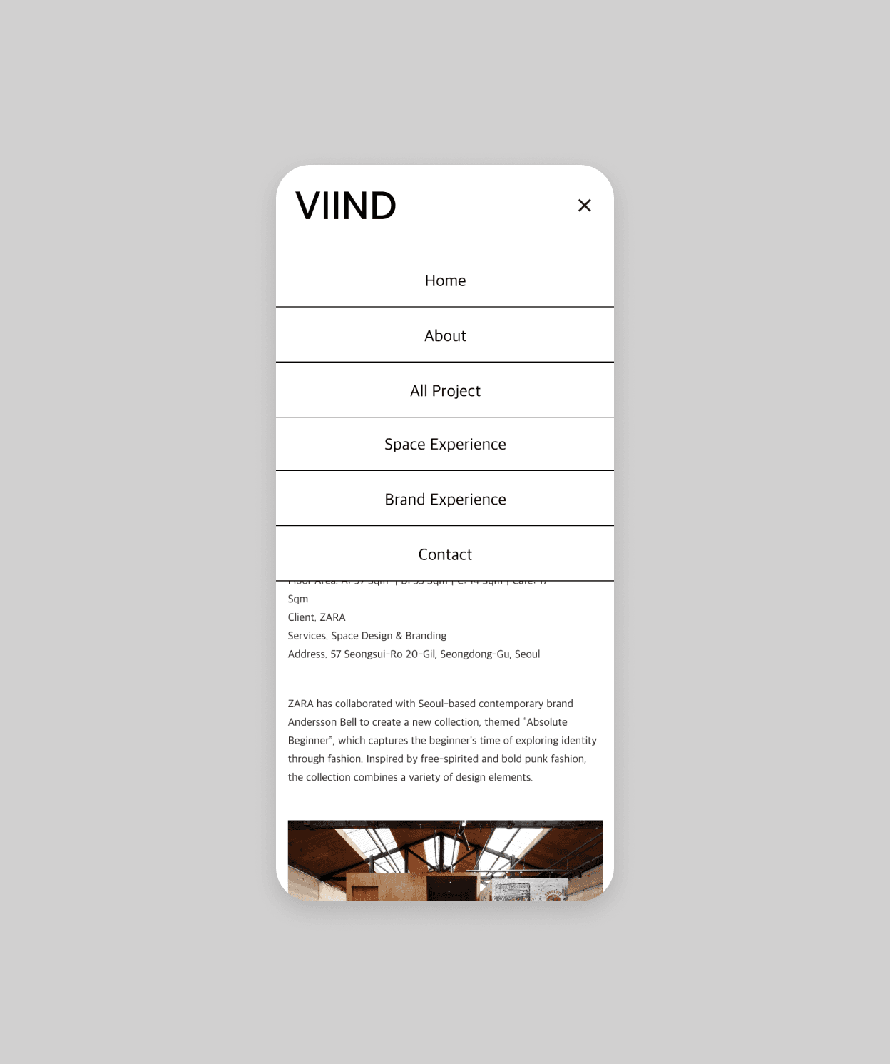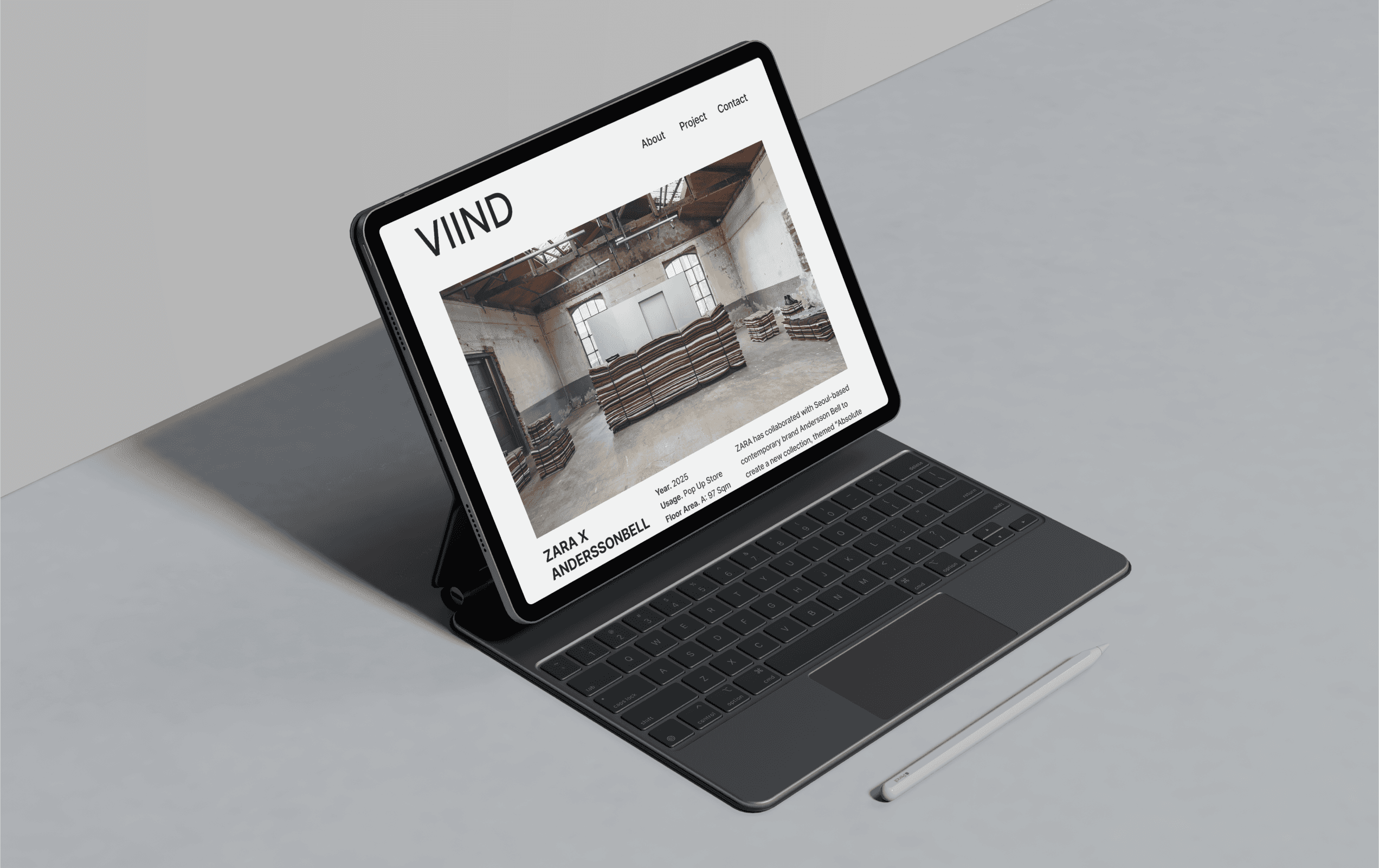 Viind is a studio with a strong focus on space and branding, and needed a web portfolio to showcase their various projects in a cohesive way. To tie together the different colors and textures of each project, we came up with the visualization of “spaces,” so I designed a responsive web that utilizes lines to separate the layout and separate the spaces, with one project in each space.