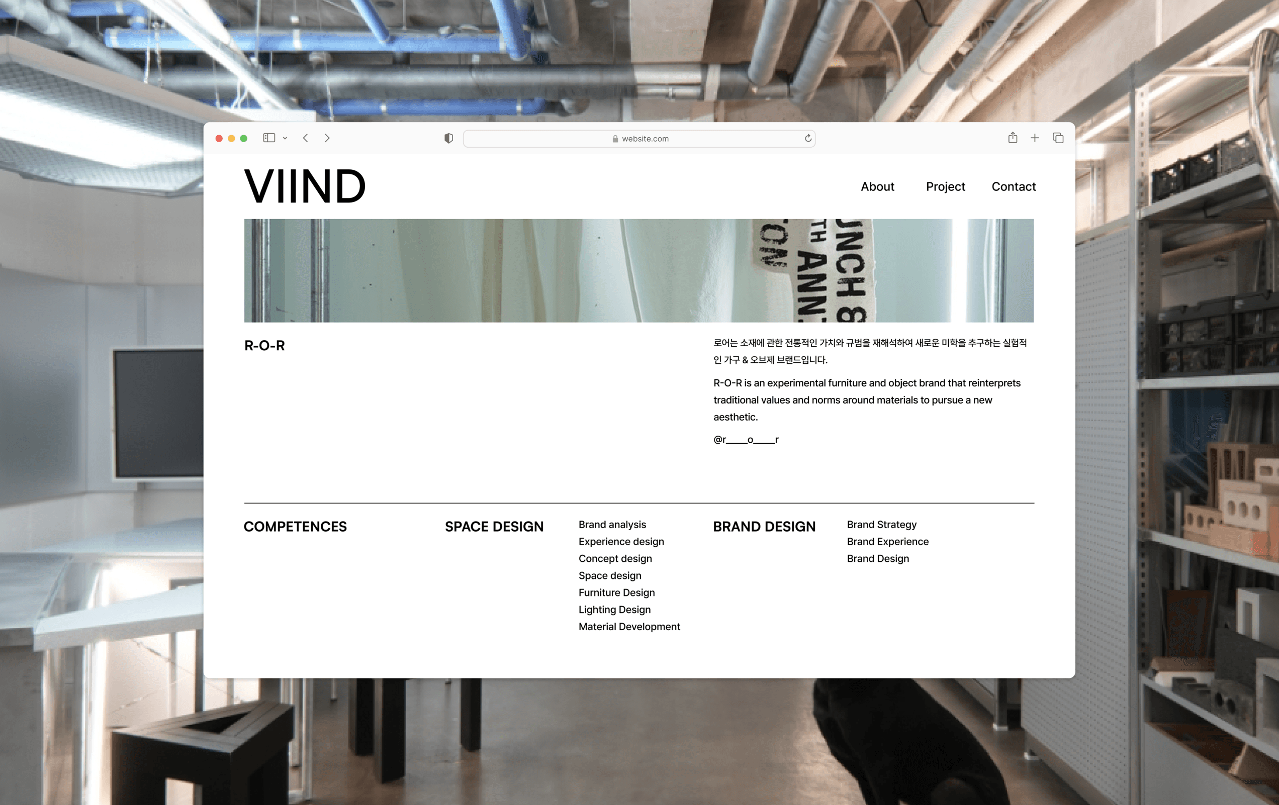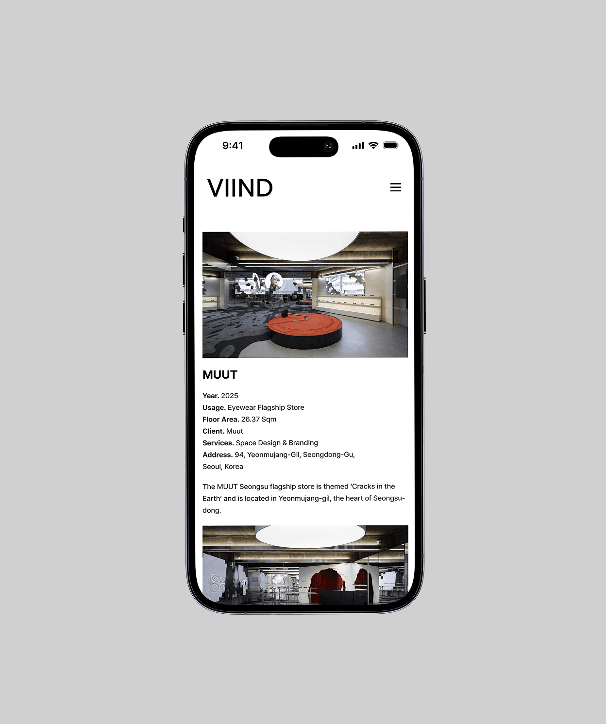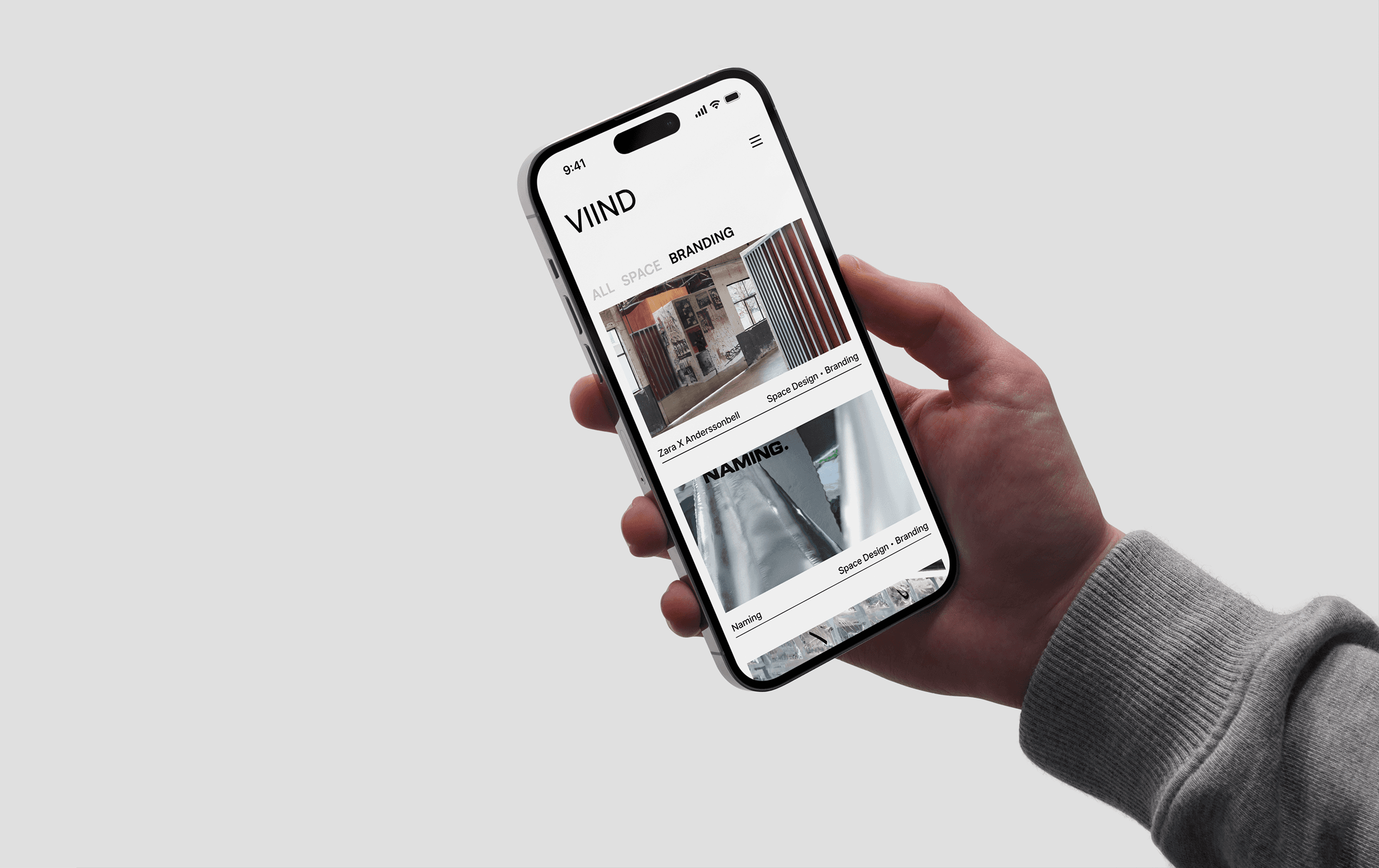 Viind is a studio with a strong focus on space and branding, and needed a web portfolio to showcase their various projects in a cohesive way. To tie together the different colors and textures of each project, we came up with the visualization of “spaces,” so I designed a responsive web that utilizes lines to separate the layout and separate the spaces, with one project in each space.